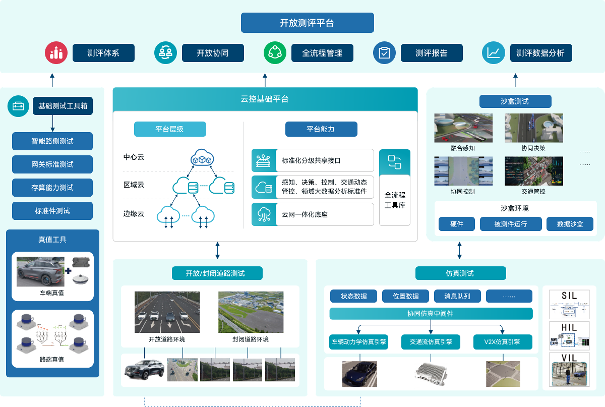 以云控基础平台为核心,构建仿真、沙盒、道路多支柱测试环境,通过开放测评平台,集成相关专业测试工具,形成全闭环的云控测评环境,支撑云控关键技术研发与突破。